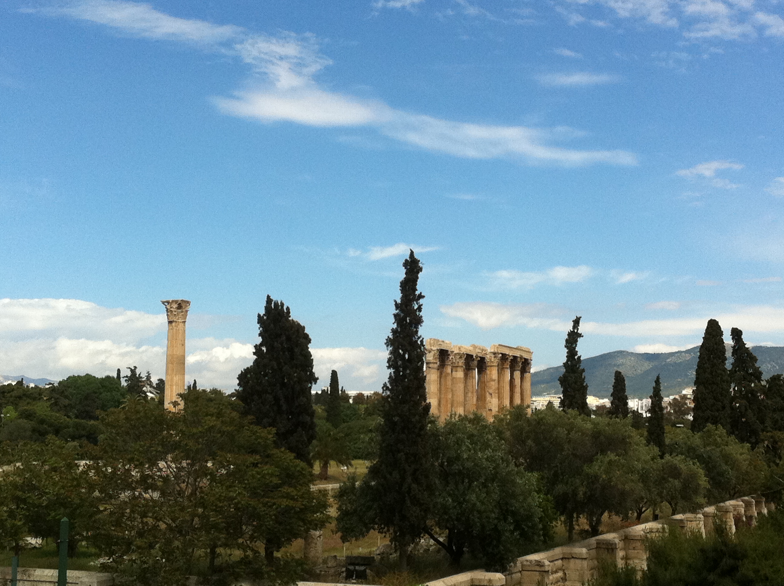 Hadrian’s Arch is right in front of the Temple of Olympian Zeus. Hadrian finished the construction that began in the 6th century B.C. and continued on and off for 700 years. Kind of like road construction projects in Atlanta 🙂 Anyway, the Olympieion (aka Kolonnes or Columns) were 360×143 feet and considered one of the largest temples in the ancient world. There were once statues of Zeus and Hadrian but those are gone now.