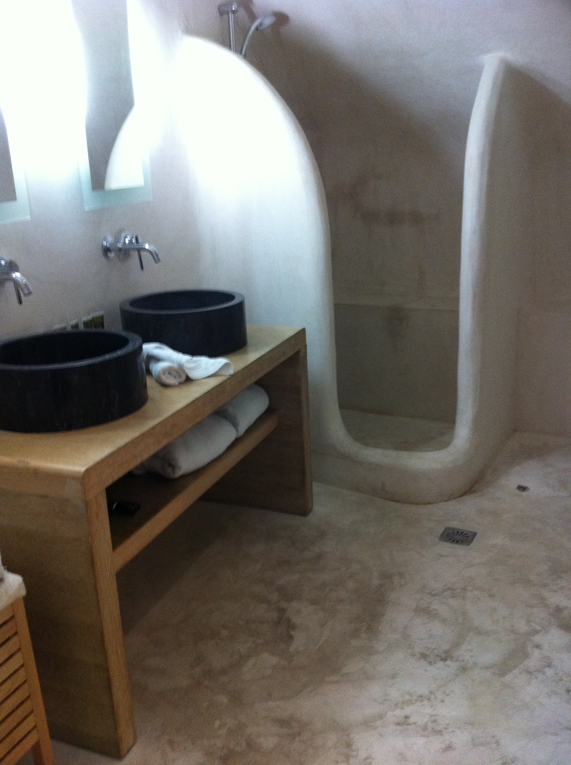 Even with all the concrete, the rooms are comfortable.  Each balcony has a private jacuzzi, loungers and a table where you can waste away an entire day while drinking mimosas and reading your Kindle or listening to music while looking at the beautiful blue ocean.  The best part?  Watching as the sun sets over the caldera.  Hint:  Order room service and eat “alfresco” on your balcony while the sun descends into the sea.  You won’t want to leave!  The beds lull you to sleep with the soft featherbed under fresh, crisp linens.  The shower is spacious and modern.  I could spend all day in there.