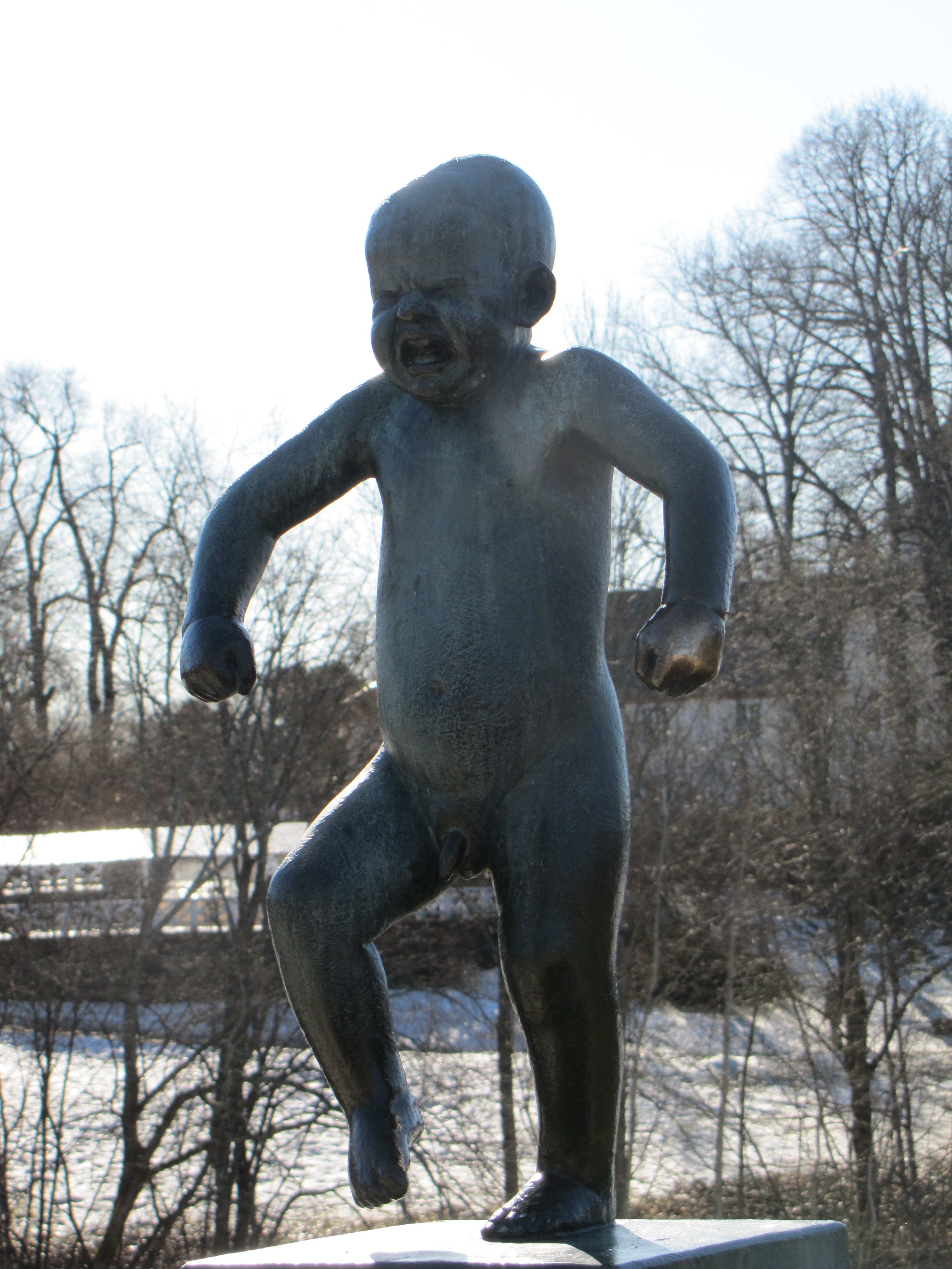 Vigeland Sculpture Park covers 80 acres and features 212 bronze and granite sculptures all designed by Gustav Vigeland. 58 of the park’s sculptures reside along the Bridge, a 100 metre (328 ft) long, 15 metre (49 ft) wide connection between the Main Gate and the Fountain. All are clad in bronze and contribute to the Human Condition theme of the park. Here visitors will find one of the park’s more popular statues, Angry Boy (Sinnataggen). Visitors could enjoy the sculptures while most of the park was still under construction. At the end of the bridge lies the Children’s Playground, a collaboration of eight bronze statues, all in the likenesses of children at play.