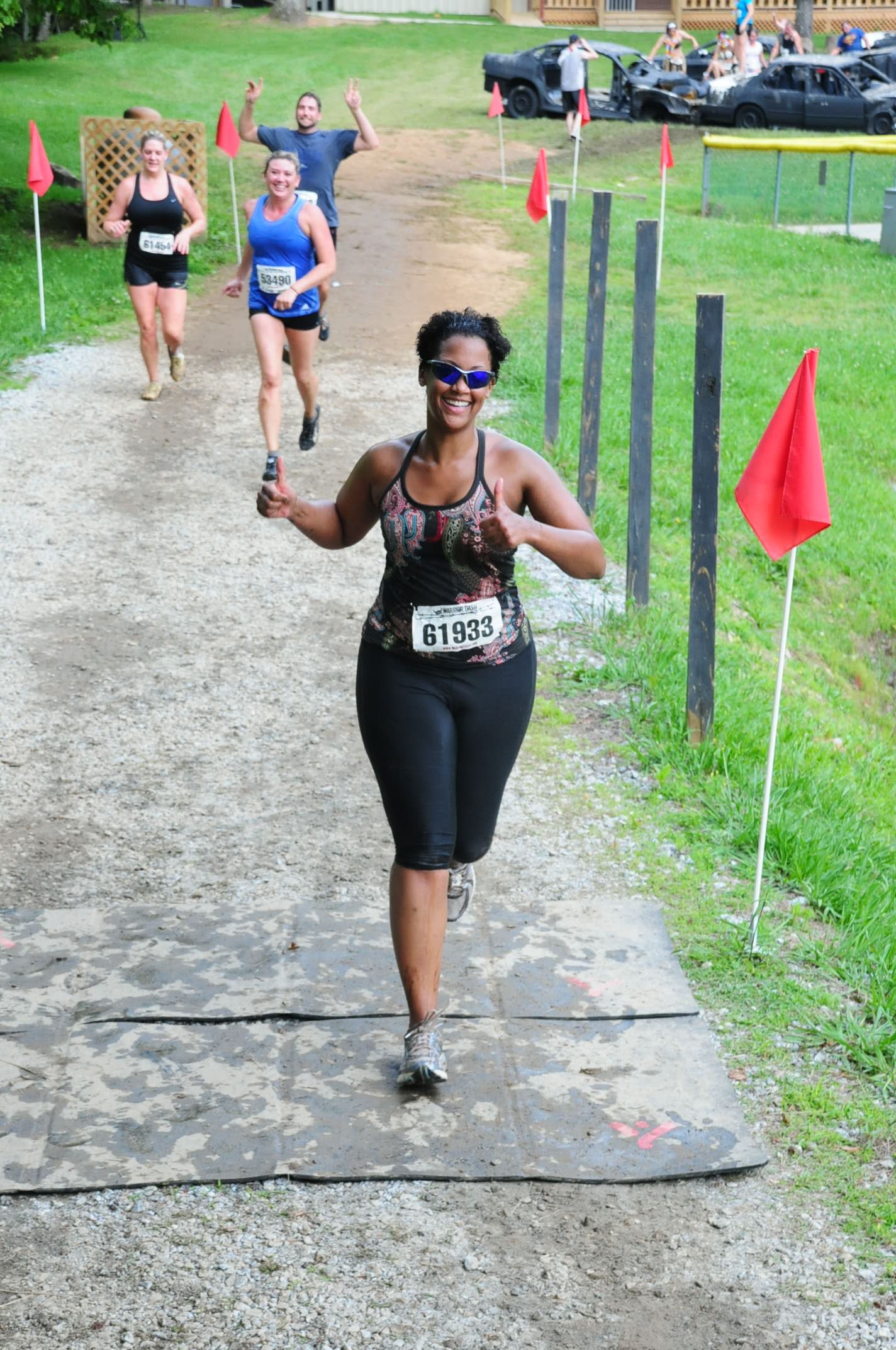 After that obstacle, the course takes you into the woods. Seriously…there is no trail. Just some red ribbon that they attached to the trees earlier that week. Good luck with that! The mud combined with no actual trail proved to be the toughest “obstacle”. And one that I wasn’t really ready for. It was difficult to keep upright because it was so slick. Trail shoes wouldn’t have made a difference because the mud cakes the soles until it was like you were running on ice. Folks loved it though…screaming WOOHOO as they slipped & slid all the way to Grandma’s house.
